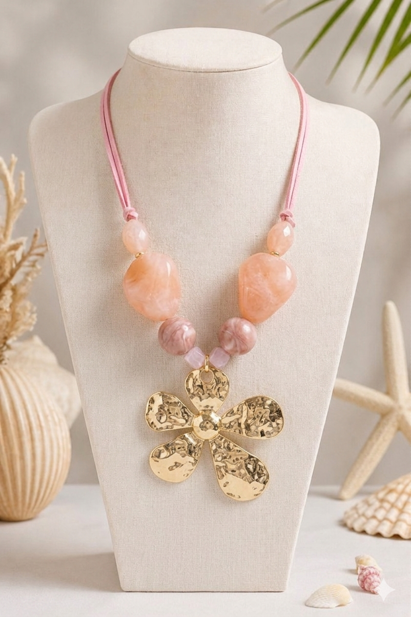 القطعة المثالية لإضافة لمسة مرحة وأنيقة لإطلالتك اليومية أو الشاطئية. يتميز هذا العقد بتصميم يجمع بين الدفء والأنوثة، حيث تتدلى منه دلاية مركزية كبيرة على شكل زهرة خماسية البتلات بلون ذهبي لامع وملمس منقوش. يزدان الحبل الوردي الناعم بخرزات كبيرة ومصقولة بألوان وردية فاتحة وناعمة، مما يجعله قطعة مميزة تبرز جمال أي قميص بسيط أو فستان صيفي.