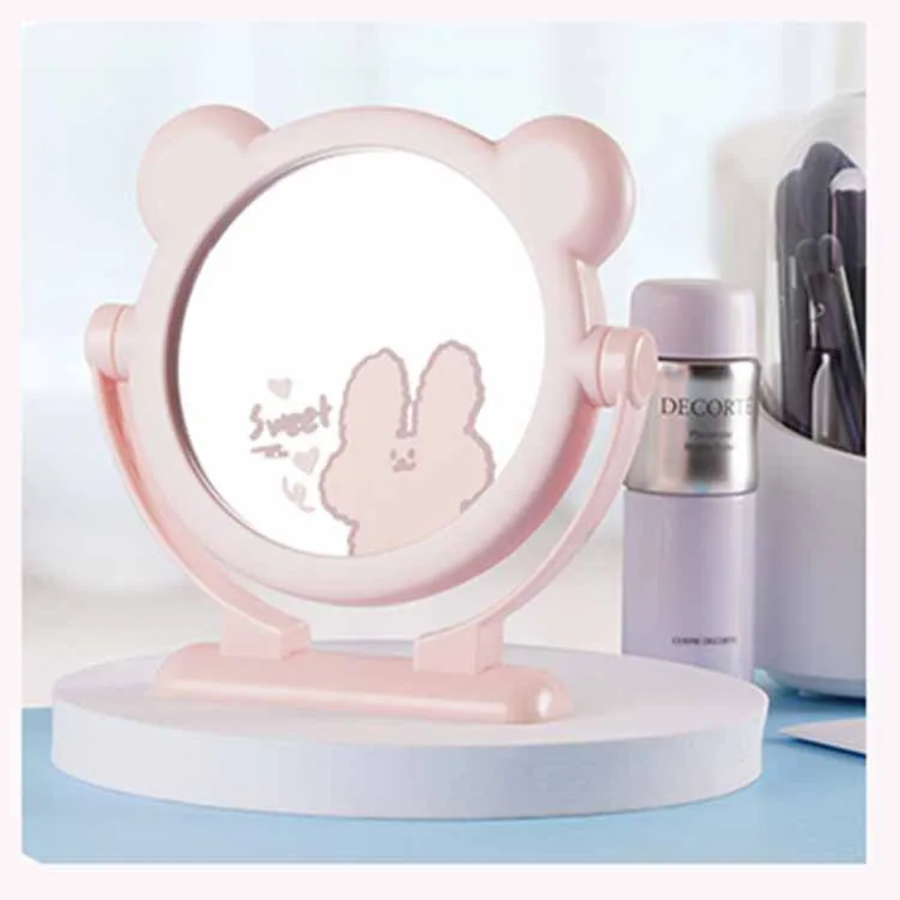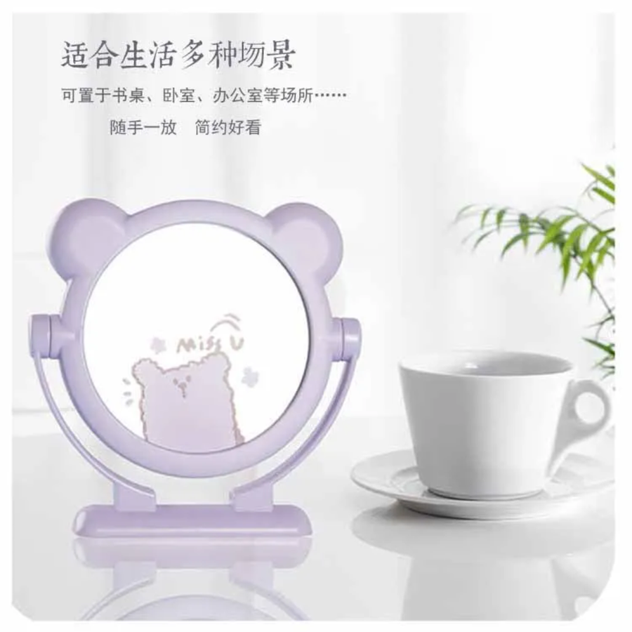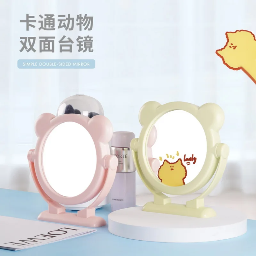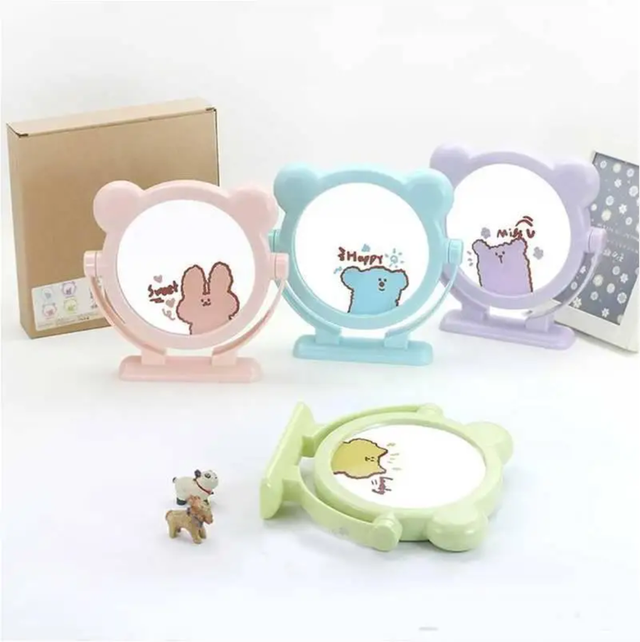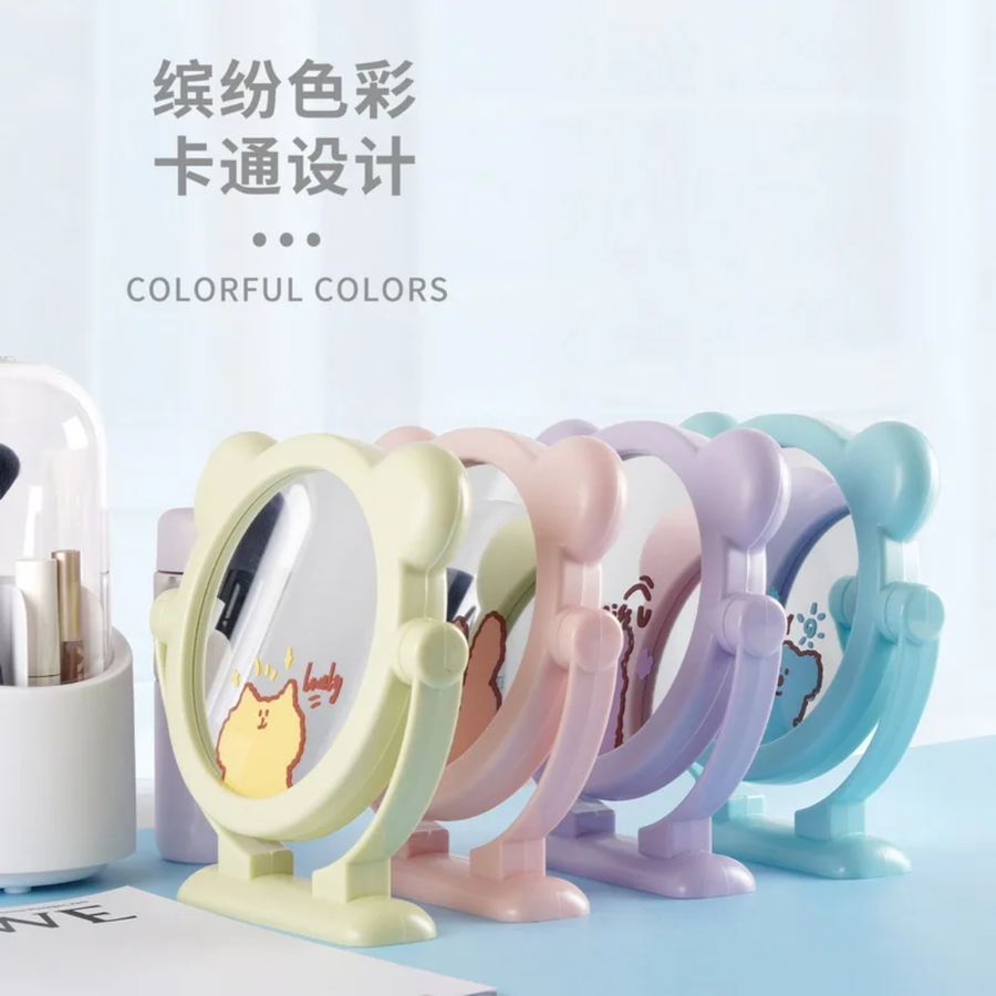 التصميم: مرآة سطح مكتب دائرية محاطة بإطار، مزينة برسومات كرتونية لإضفاء لمسة جمالية.