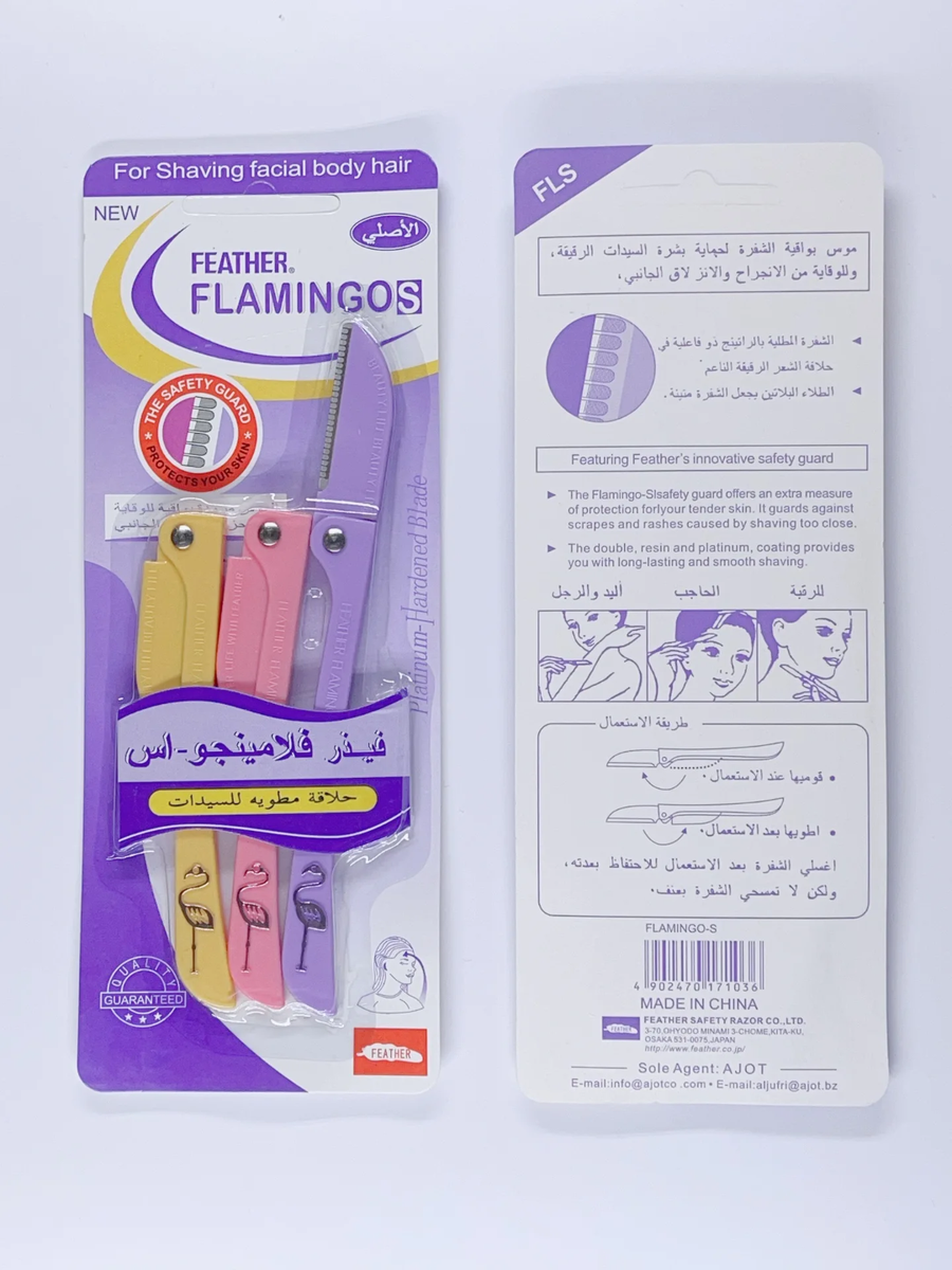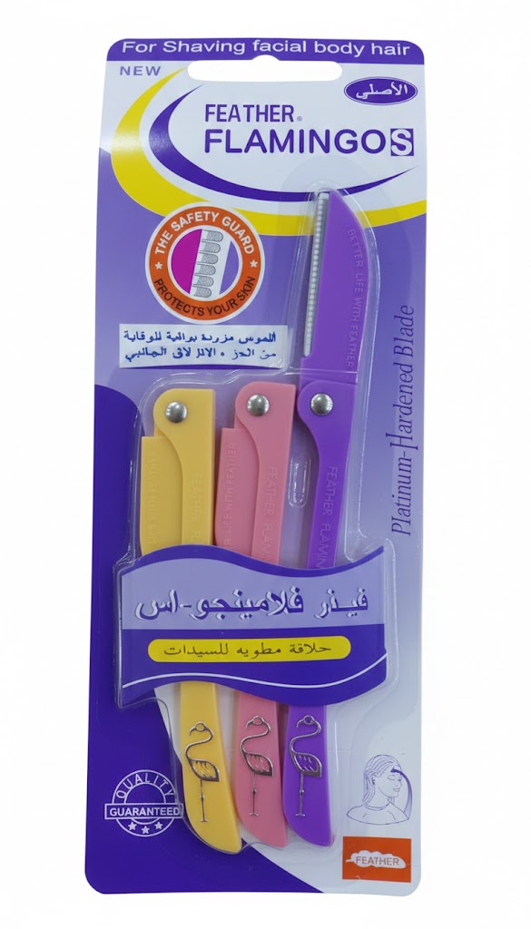 عد شفرات "فيذر فلامينجو-اس" الخيار الأول عالمياً للعناية بالبشرة وإزالة الشعر الوبري من الوجه والجسم بدقة متناهية. يأتي الطقم مكوناً من 3 ألوان زاهية (الأصفر، الوردي، البنفسجي) بتصميم ذكي قابل للطي يضمن سهولة التخزين والحفاظ على حدة الشفرة. تتميز هذه الشفرات بقدرتها على تقشير البشرة بلطف وإزالة الجلد الميت، مما يجعل توزيع المكياج أكثر سلاسة وجمالاً
