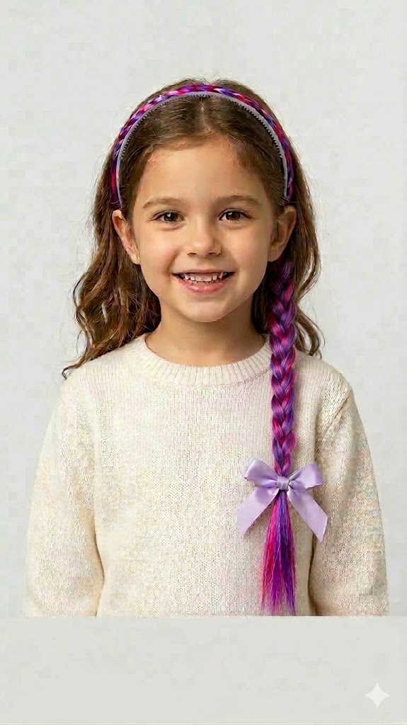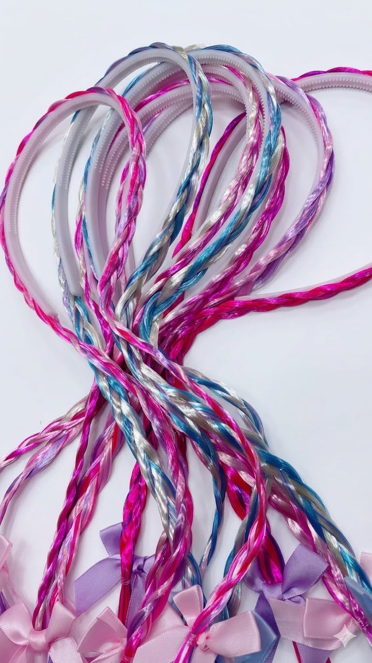 التصميم: طوق رأس مرن مدمج به ضفائر طويلة ملونة تعطي شكلاً طبيعياً وجذاباً، ومزين بفيونكات ستان رقيقة في نهاية الضفيرة.