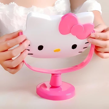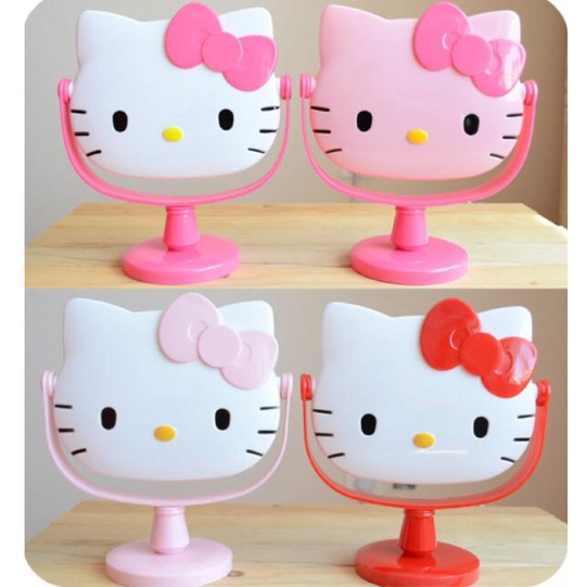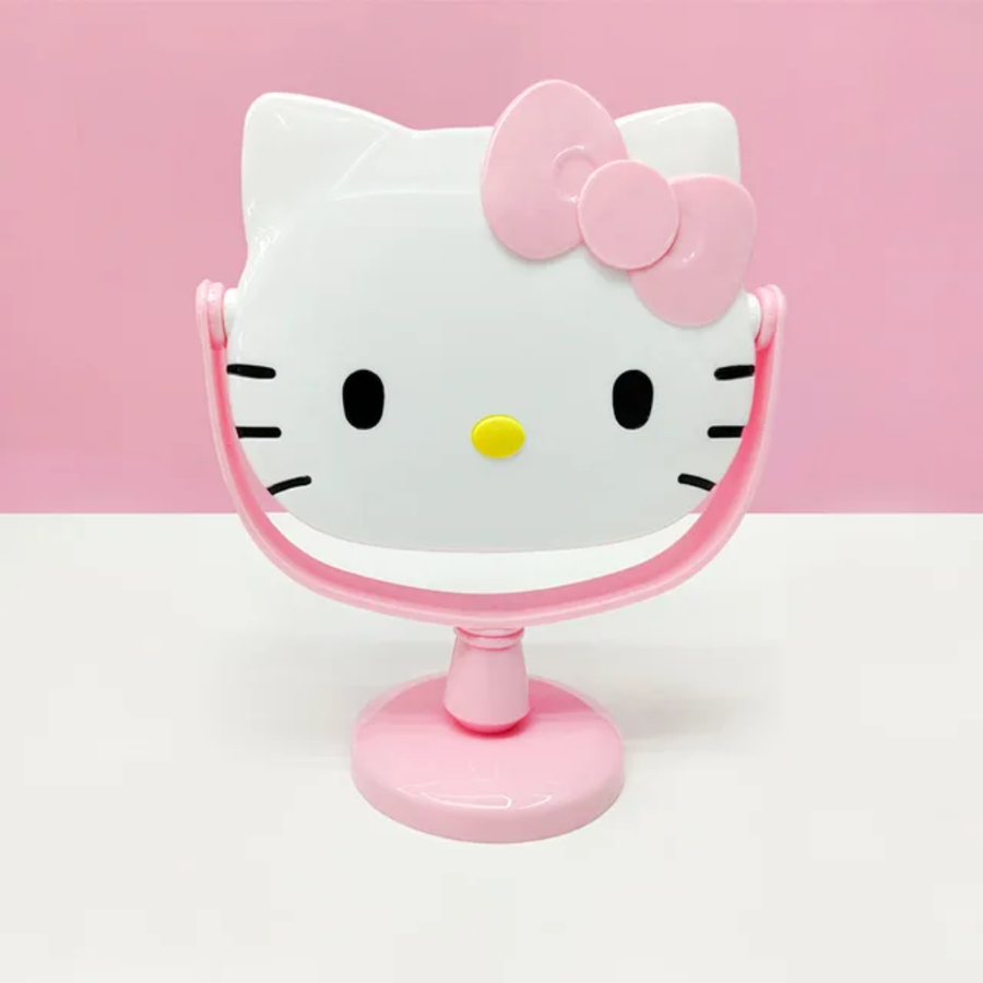 التصميم: مرآة سطح مكتب كلاسيكية تأتي على شكل وجه شخصية "هالو كيتي" الشهيرة، مع الفيونكة المميزة وتفاصيل الوجه الدقيقة.