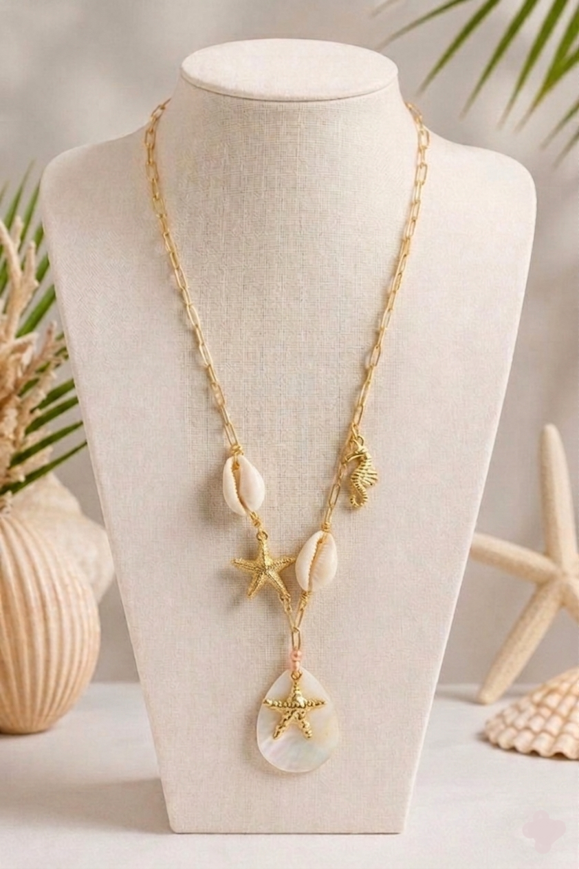 التصميم: يتميز العقد بتصميم جريء وفريد (Statement Design) يعتمد على السلاسل السميكة (Chunky Chain) التي تضفي لمسة عصرية قوية، مع دلايات بحرية كبيرة الحجم تعكس فخامة الطبيعة.