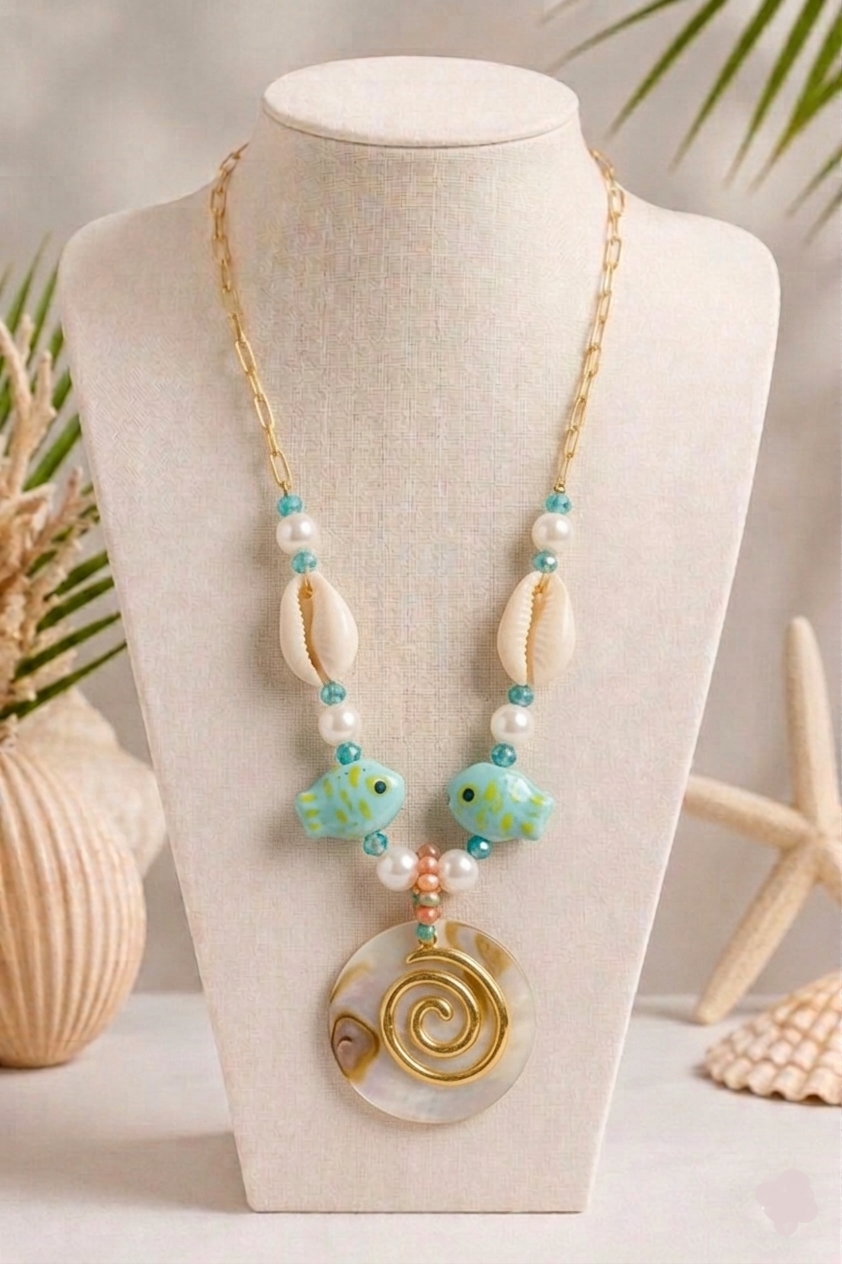 التصميم: قلادة فنية مستوحاة من أعماق البحار، تتميز بدلاية دائرية من صدف اللؤلؤ يتوسطها لولب ذهبي، ومزينة بخرز على شكل أسماك فيروزية وأصداف بحرية.