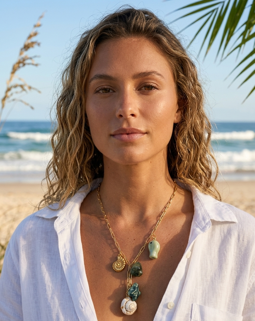 قوقعة بيضاء بتفاصيل دقيقة تمنح التصميم طابعاً كلاسيكياً صيفياً.