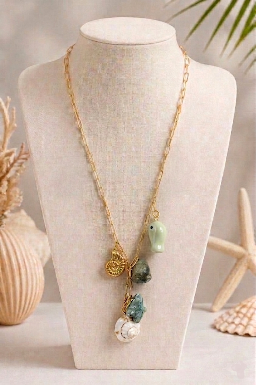 مجموعة من الدلايات الفنية التي تشمل أشكالاً بحرية مطلية، وأحجاراً ناعمة بألوان زيتية وخضراء جذابة.
